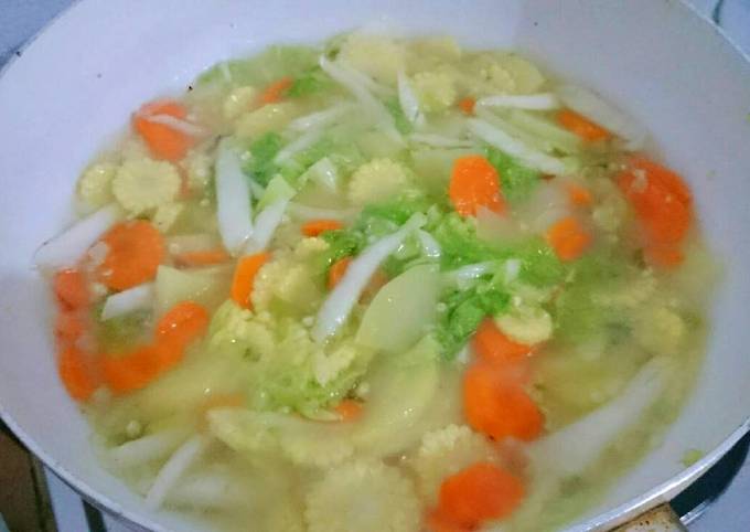 Capcay Kuah ini merupakan pilihan yang tepat ketika Bunda tidak mempunyai banyak waktu luang untuk memasak tetapi ingin memberikan masakan yang praktis lezat tetapi tetap sehat untuk keluarga. Bisa dilihat dari sayur wortel dan batang cai sim sudah lunak atau belum. Tuang bahan kuah dan aduk rata.